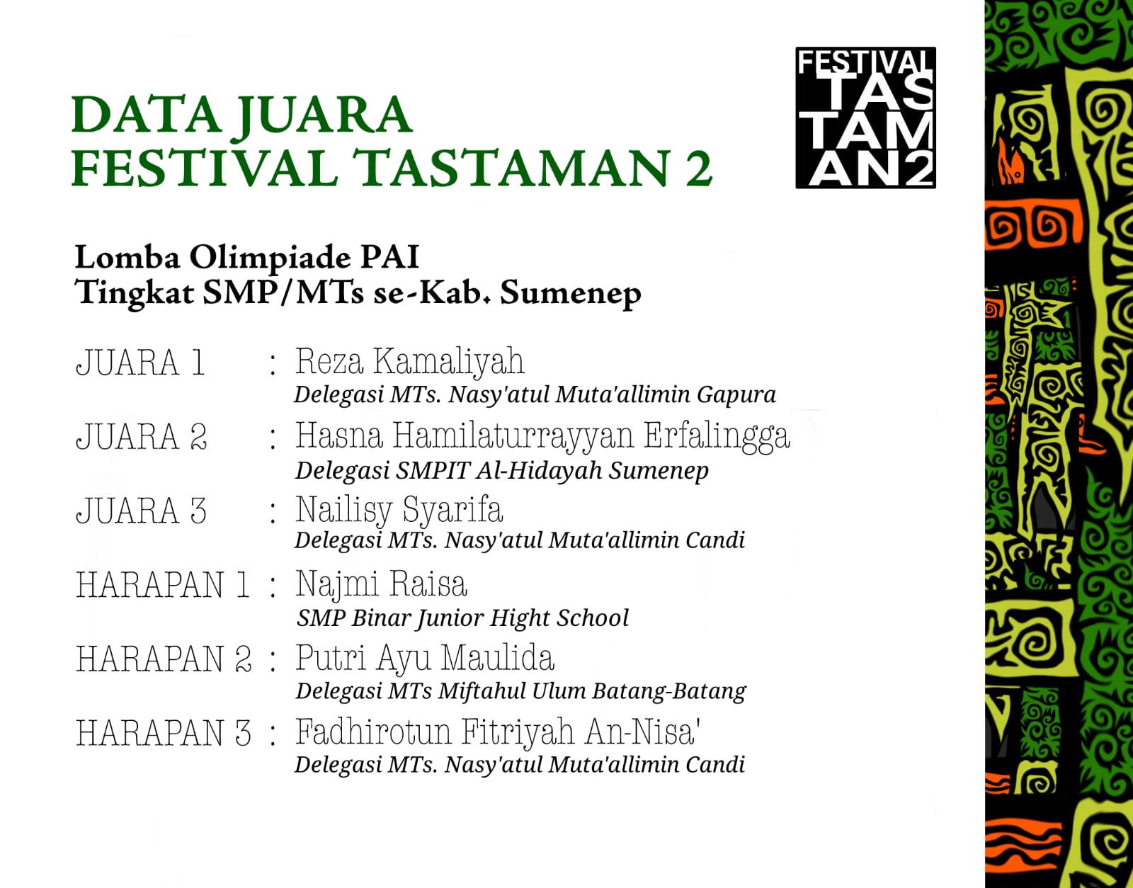 Mereka ialah Nailisy Syarifah dan Fadhiratun Fitriyah An-Nisa. Keduanya siswa kelas IX A MTs Nasy-mut. Nailisy Syarifah berhasil menjadi juara 3, sedangkan Fadhiratun Fitriyah An-Nisa meraih juara harapan 3. Mereka berhasil menjadi salah satu yang unggul di antara 52 peserta yang ada.